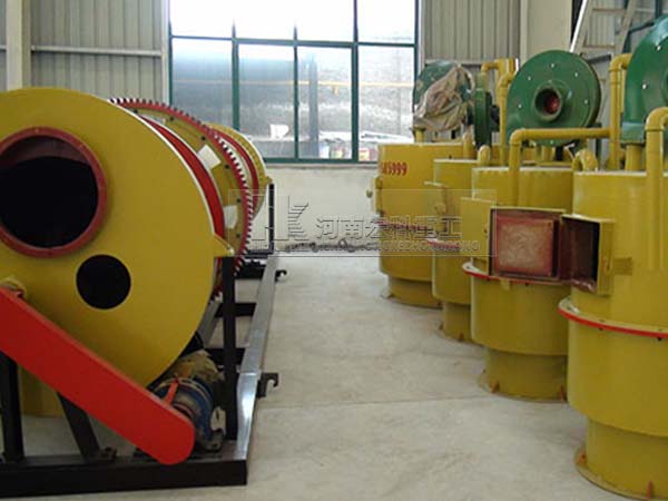 鸡屎烘干机现场物料经铲车送到料仓再送到定量输送的螺旋进料口进入烘干机内,烘干机筒体内附有扬料板,中间有搅拌打散系统,筒体转速和搅拌轴的转速均可快慢调节,从而可使物料颗粒均匀,吸收充分热量烘干速度快。烘干后的物料经皮带输送机运至料场,燃烧部分由煤经煤气发生炉转化成煤气进行燃烧,进一步提高燃料利用率,减少了因煤直接燃烧生成大量硫化物、粉尘造成的污染,烘干过程中的烟气经旋风除尘器收尘进入水池吸收处理。