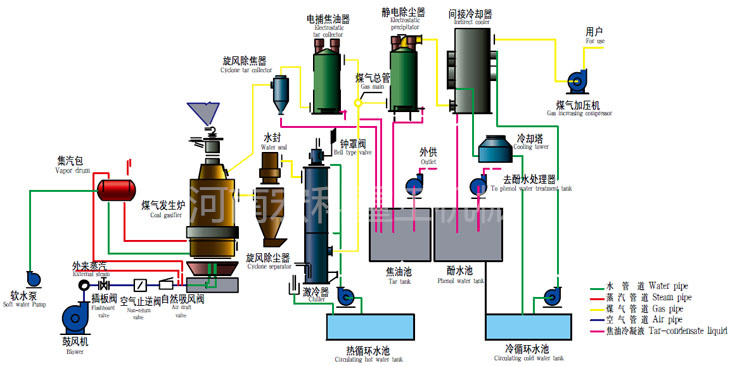 两段式煤气发生炉是由干馏段和气化段组成的煤气化设备。它以40~60mm的烟煤为原料,在煤气炉上段中进行干馏,干馏生成的半焦进入两段炉的下段进行气化反应。煤的干馏和气化集中在同一气化炉内完成,对生成的干馏煤气和气化煤气经优化配置的后处理设备分别进行除尘、除油、冷却、脱硫等工艺处理。经过处理后的洁净煤气经加压输送系统供给工业窑炉作为燃料使用。整个系统包括煤场、渣场、煤提升系统、煤仓、供煤系统、供风系统、两段炉气化系统、除尘净化系统、冷却系统、轻焦油捕集及回收系统、酚处理及酚水焚烧系统、脱硫系统、自动控制系统、煤气贮存及加压输出系统。